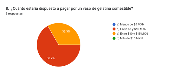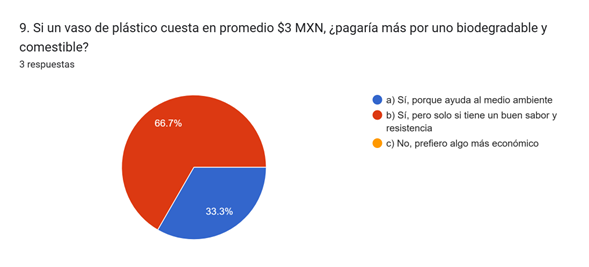 El 66.7% de los encuestados respondió que sí, pero solo si tiene un buen sabor y resistencia, mientras que el 33.3% dijo que sí, porque ayuda al medio ambiente. Ninguna persona eligió la opción de preferir algo más económico. Esto indica que todos los encuestados están dispuestos a pagar más por un vaso biodegradable, siempre que cumpla con expectativas de calidad o impacto ambiental, lo que representa una buena oportunidad para posicionar el producto como una alternativa ecológica y funcional.